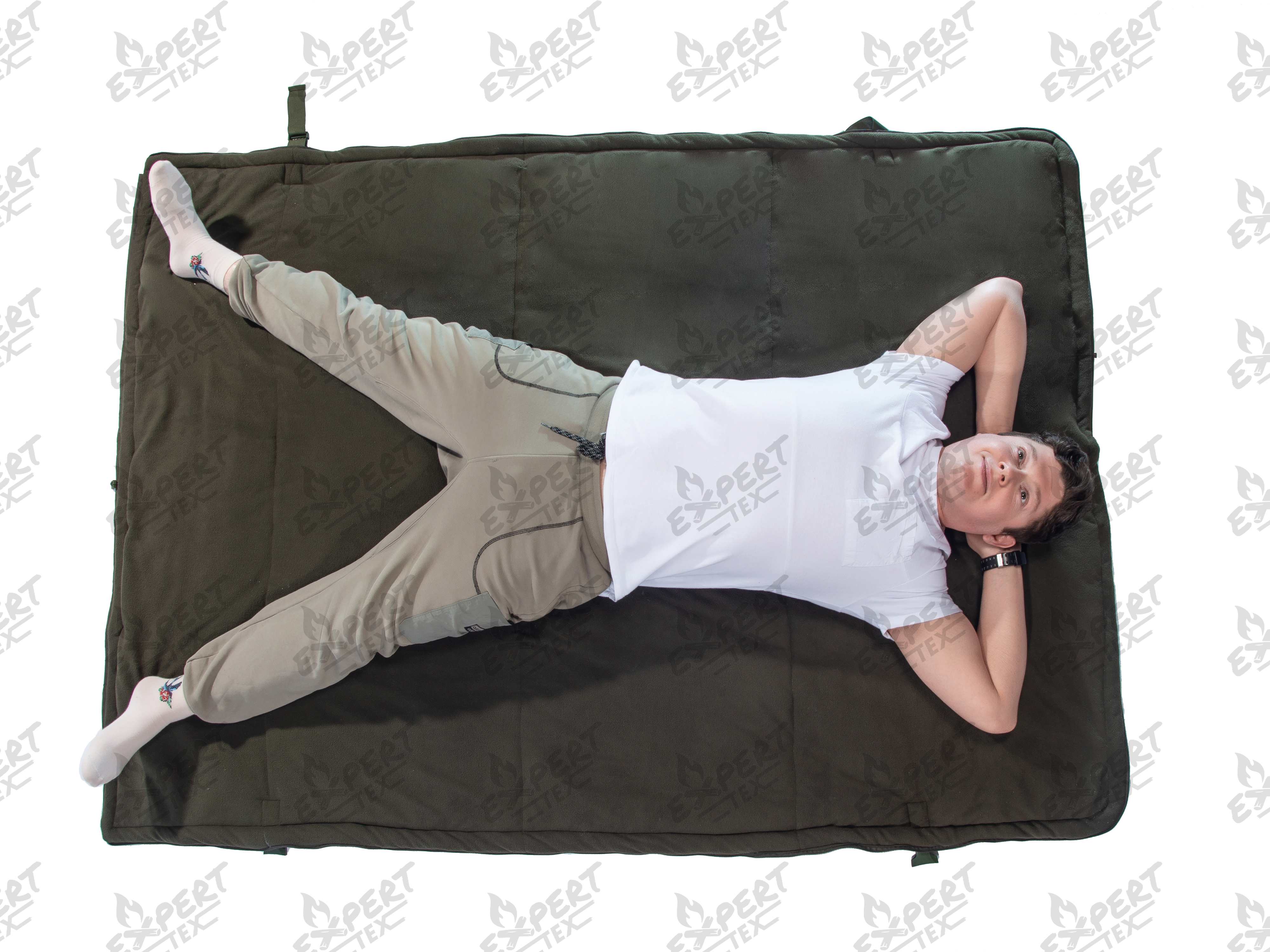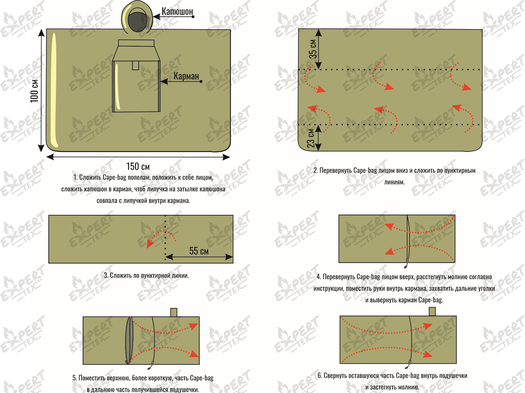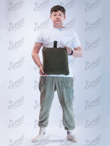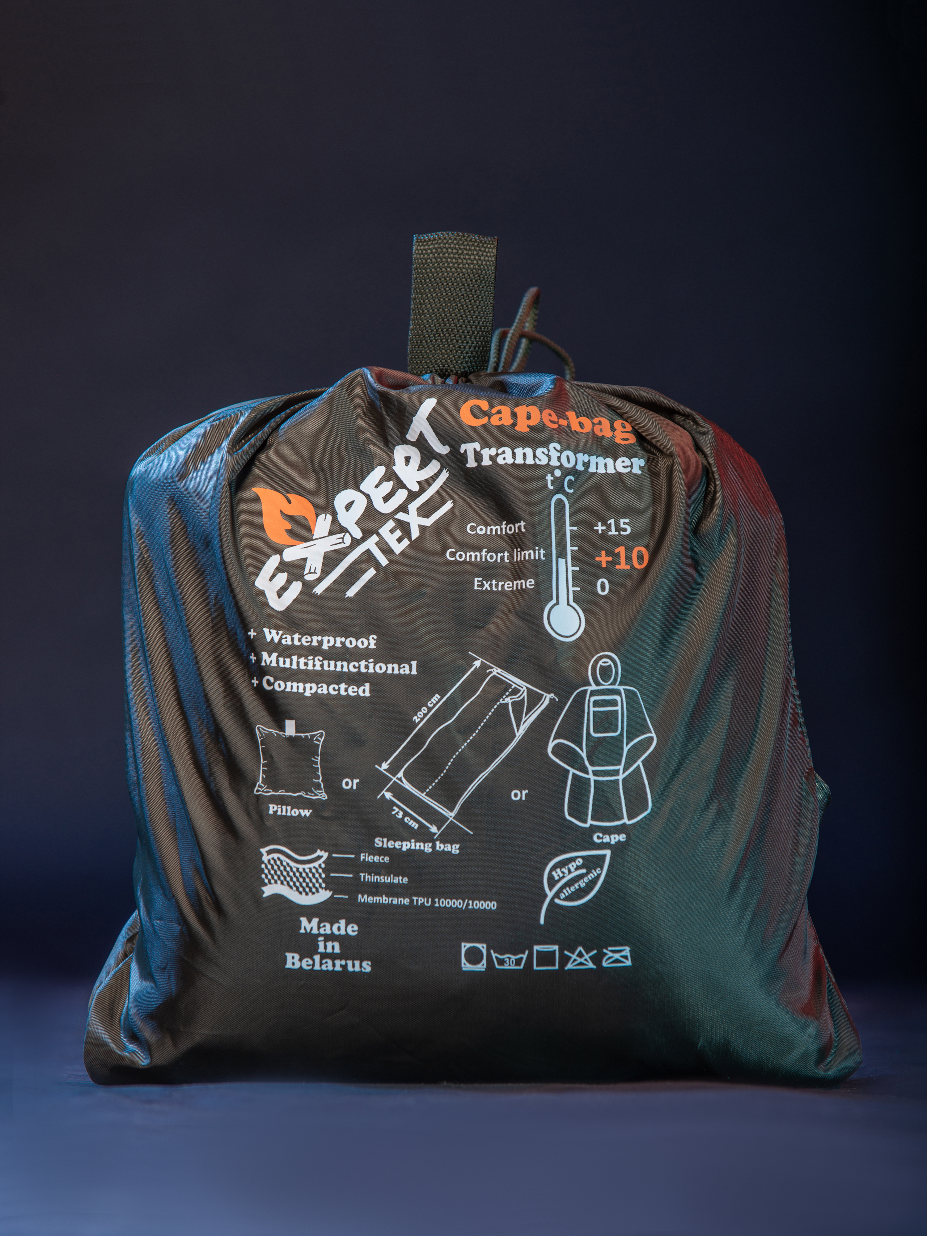 При трансформации Cape-bag преобразуется в спальный мешок. Утягивающая шнуровка с удобными фиксаторами вверху спального мешка позволяет наиболее комфортно утянуть верх спальника, чтобы сохранить тепло во время сна. Расстегнув молнию, спальный мешок можно использовать как одеяло, просто укрывшись им. При складывании в собственный карман, Cape-bag приобретает форму удобной небольшой подушки квадратной формы. Внутренняя часть изделия изготовлена из флиса, главным достоинством которого является выведение влаги с поверхности кожи. Благодаря этому его использование стало распространенным: от легких форм нательного белья до подкладок теплой зимней одежды.