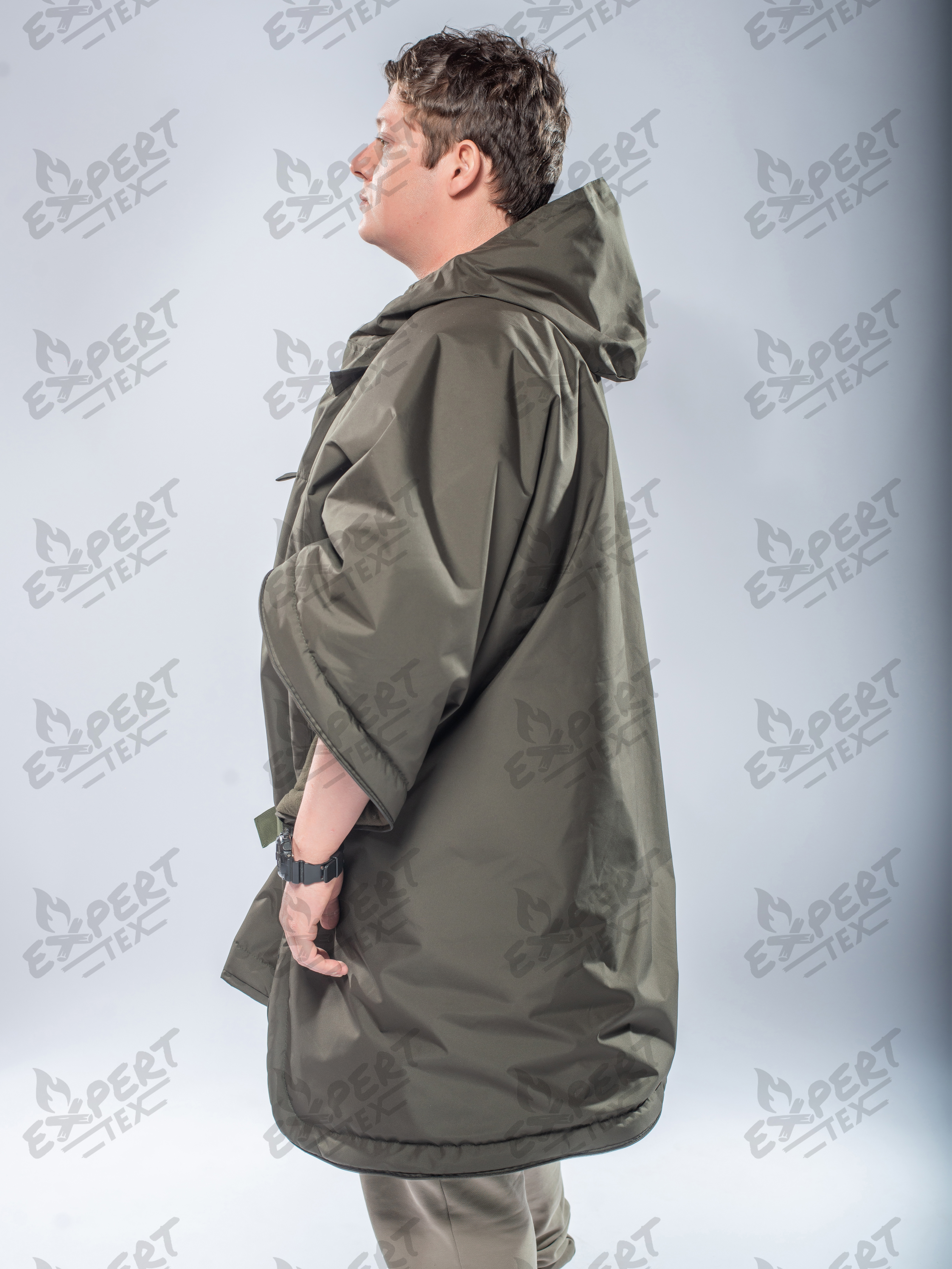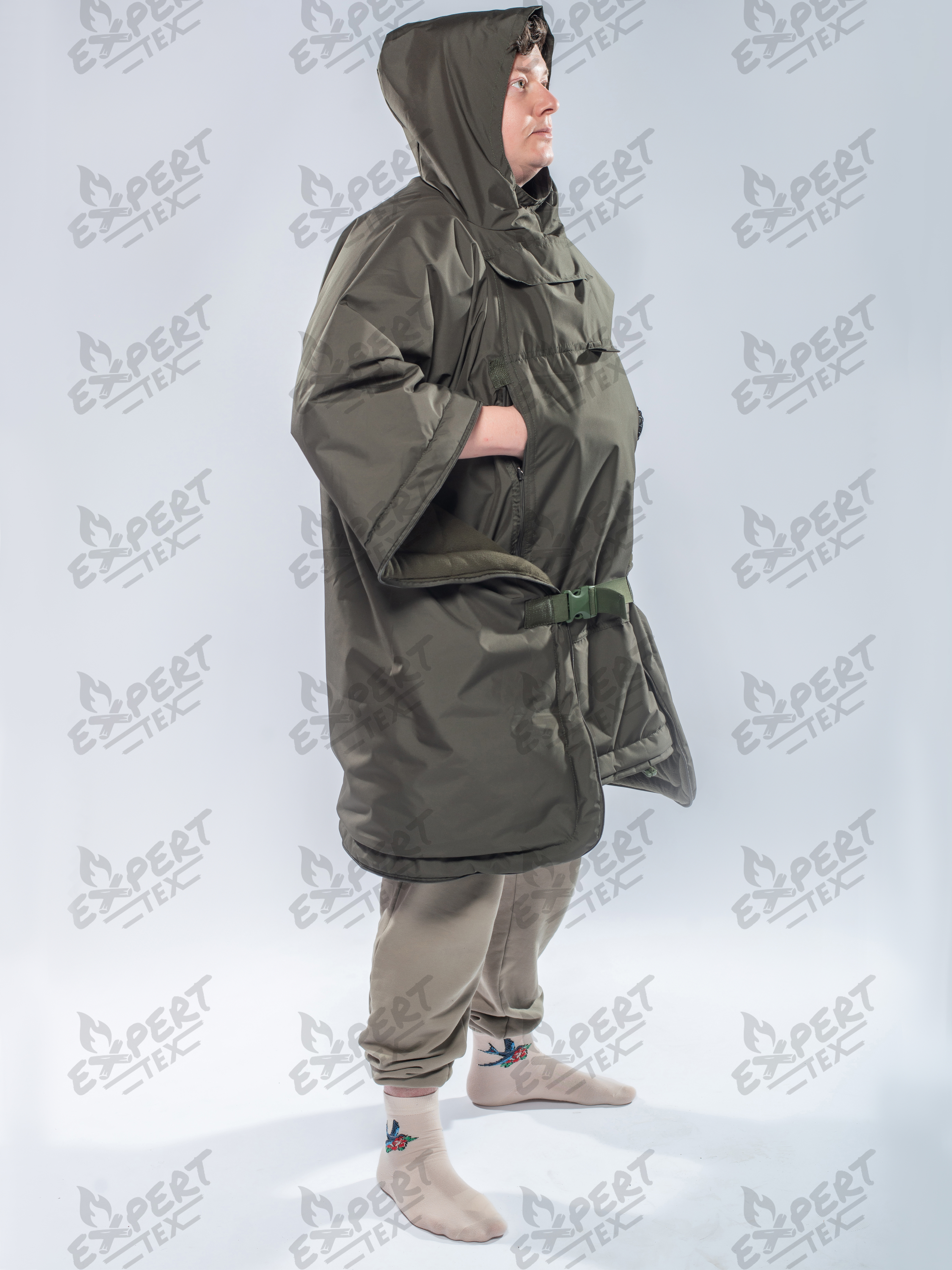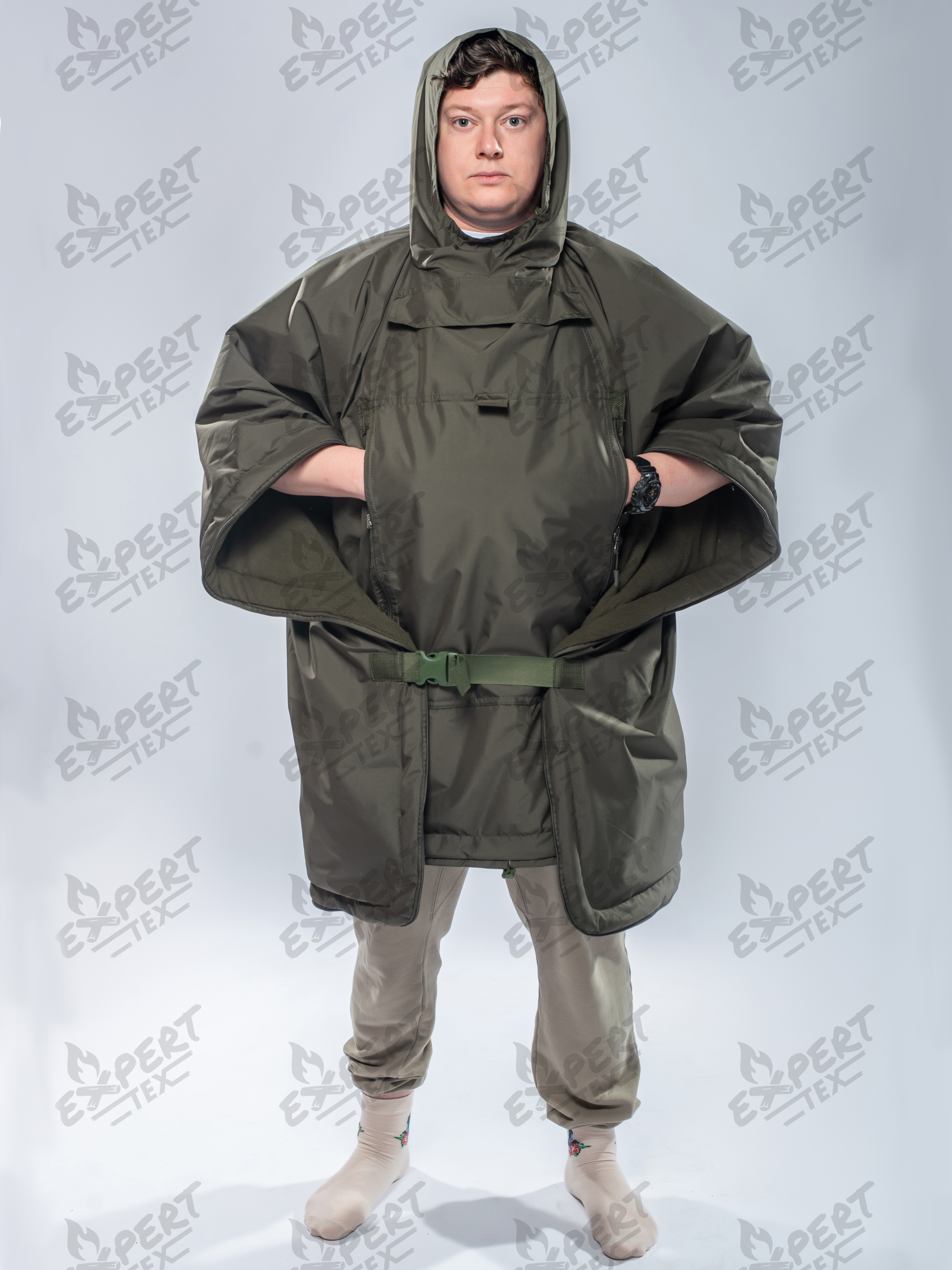 - утягивающийся капюшон в плаще и верх в спальнике;