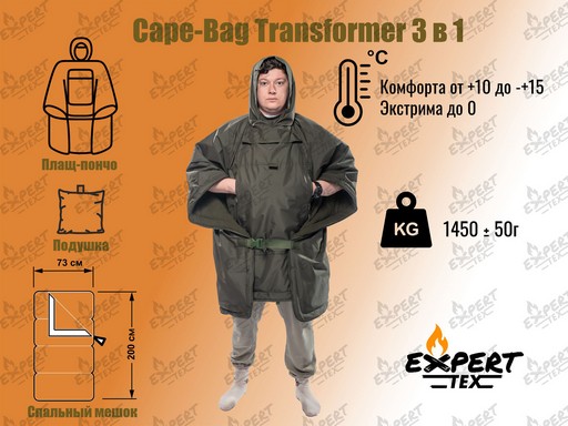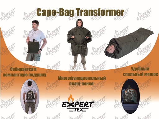 Cape-bag Transformer (Кэйп-Бэг Трансформер)— уникальная куртка-плащ с капюшоном (пончо) трансформирующаяся в спальный мешок. Как пончо имеет размер one size (универсальный размер, подходящий для людей любой комплекции) и способен защитить от непогоды: ветра, дождя или снега. Козырек на капюшоне, а также утягивающая шнуровка по контуру лица, придает дополнительную защиту от различных осадков. На передней части имеется утепленный карман, закрывающийся с обеих сторон молниями, который также служит и упаковкой изделия. Над ним расположен еще один небольшой карман с клапаном на липучке сверху для хранения небольших вещей. Внизу изделия имеются специальные застёжки на резинках сзади и впереди, чтобы минимизировать проникновение холодного воздуха внутрь, при этом не стесняя движений при любой деятельности, а плащ приобретает вид удлиненной куртки.
