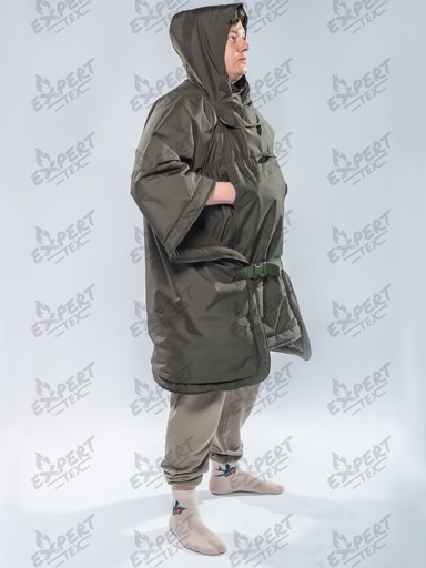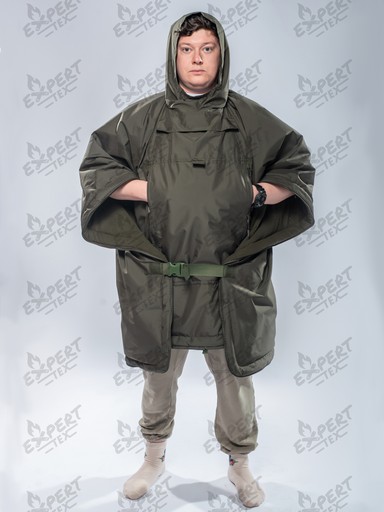 Верх - «дышащая» мембранная ткань, подкладка — флис, наполнитель — тинсулейт. Размер: 200×73 см (спальный мешок), 200×146 см (одеяло) или one size (пончо).